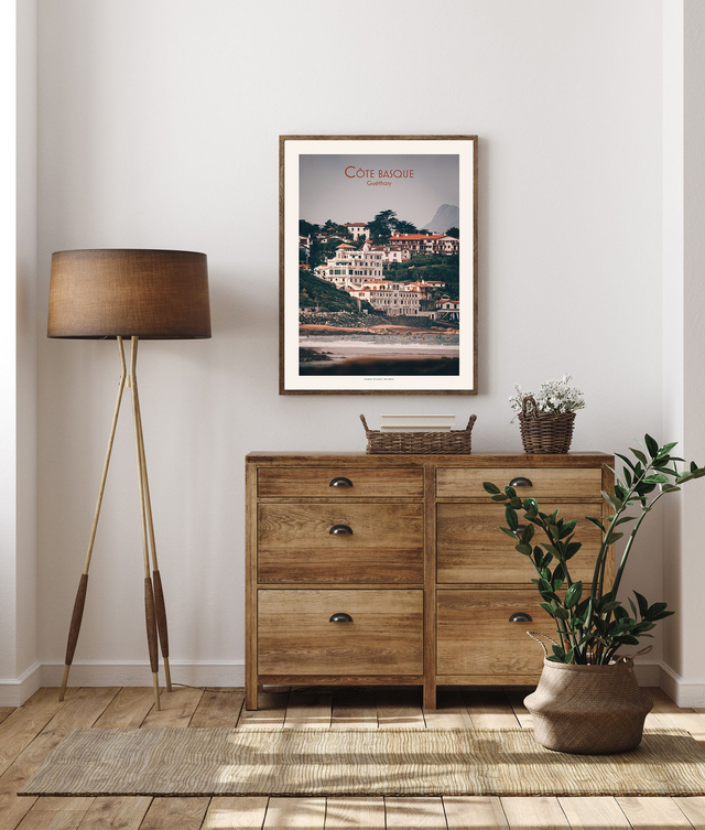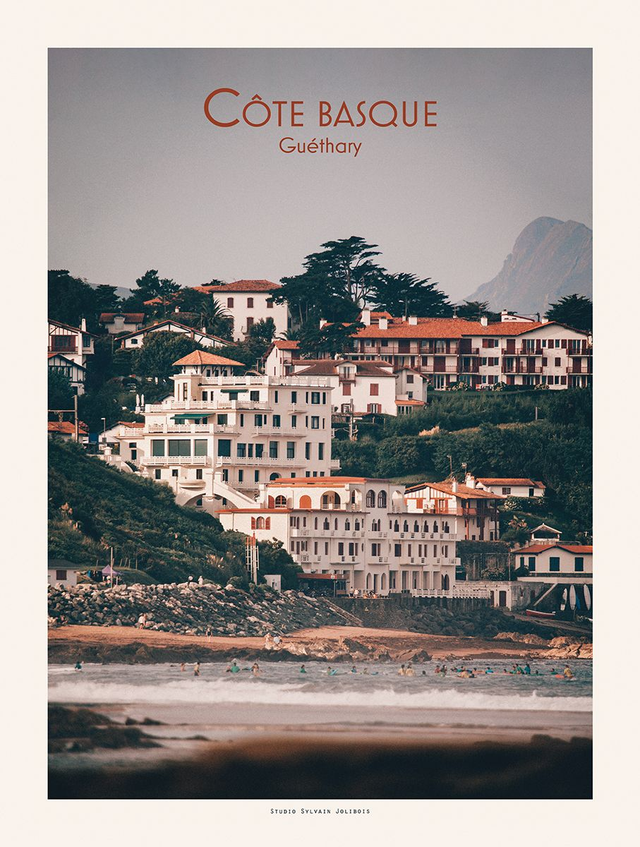 Cette affiche est réalisée à partir d'une photographie de la côte basque. Un point de vue unique sur le bas du village de Guéthary, et son architecture art déco.