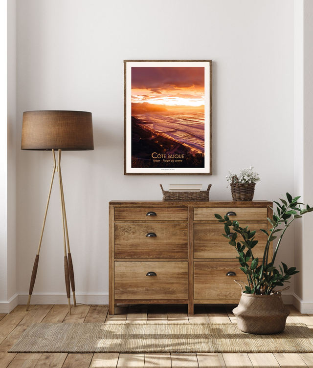 Cette affiche est réalisée à partir d'une photographie de la plage du centre, à Bidart. L'hiver, les journées peuvent être nuageuses mais se terminer dans un éclat de lumière, de couleurs...